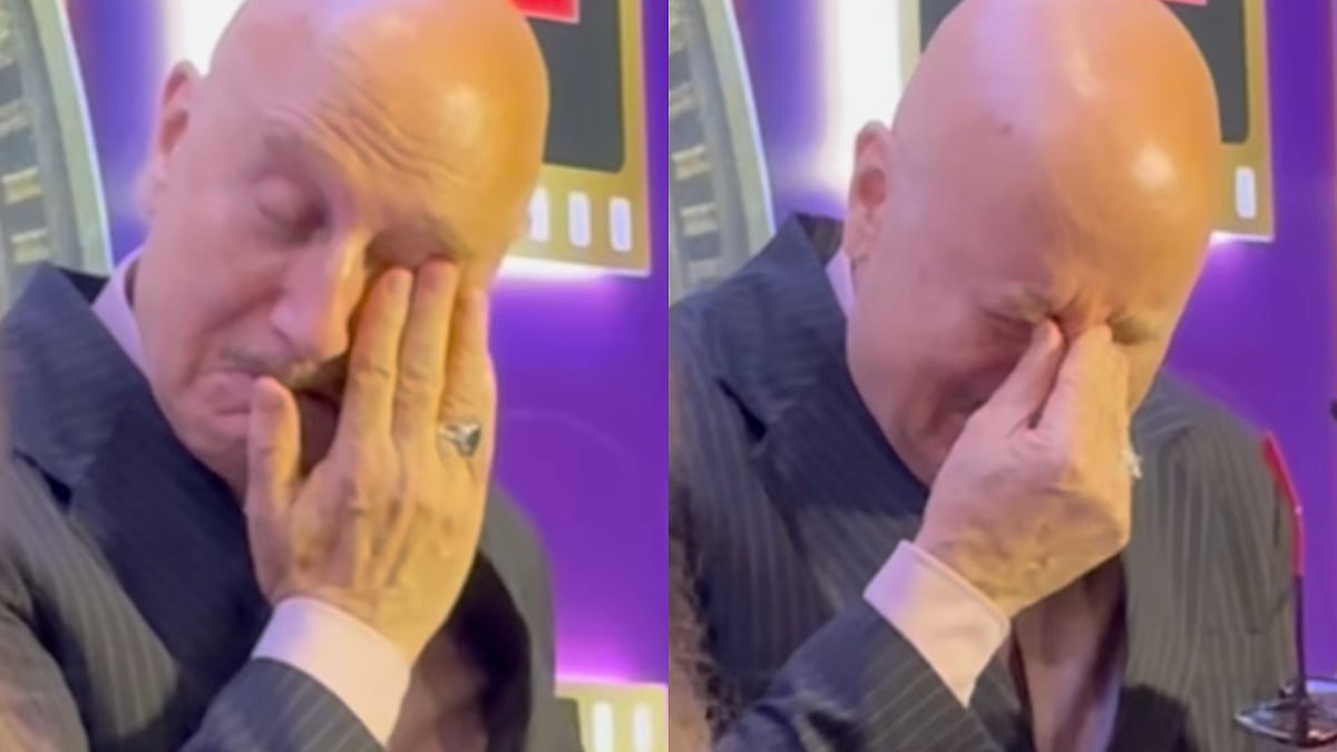 Dressed in a suit, before cutting his birthday cake, Anupam Kher became emotional upon receiving the surprise and broke down in tears.